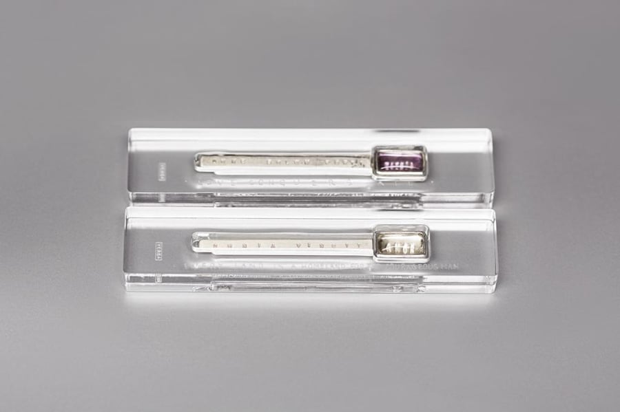 silver brooch with rock crystal / amethyst and inscription in Latin