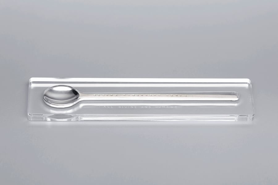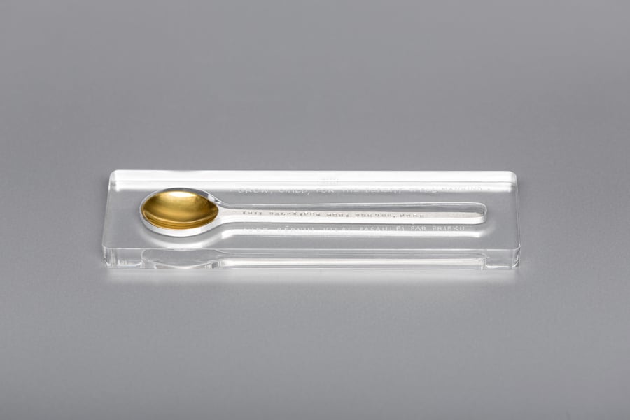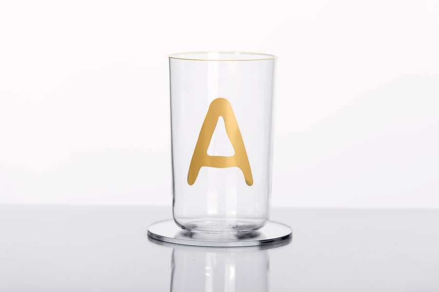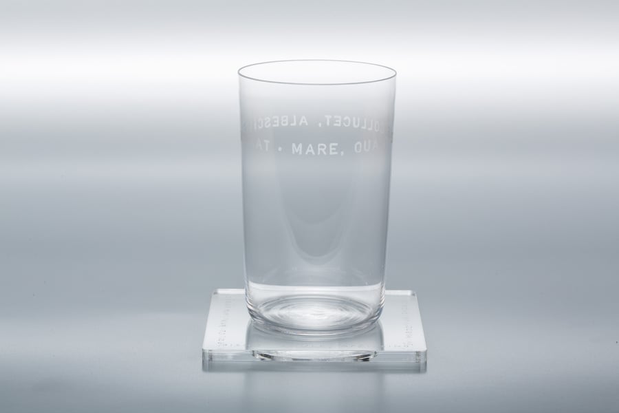 VERBA pink water glass with inscription in Latin or Ancient Greek