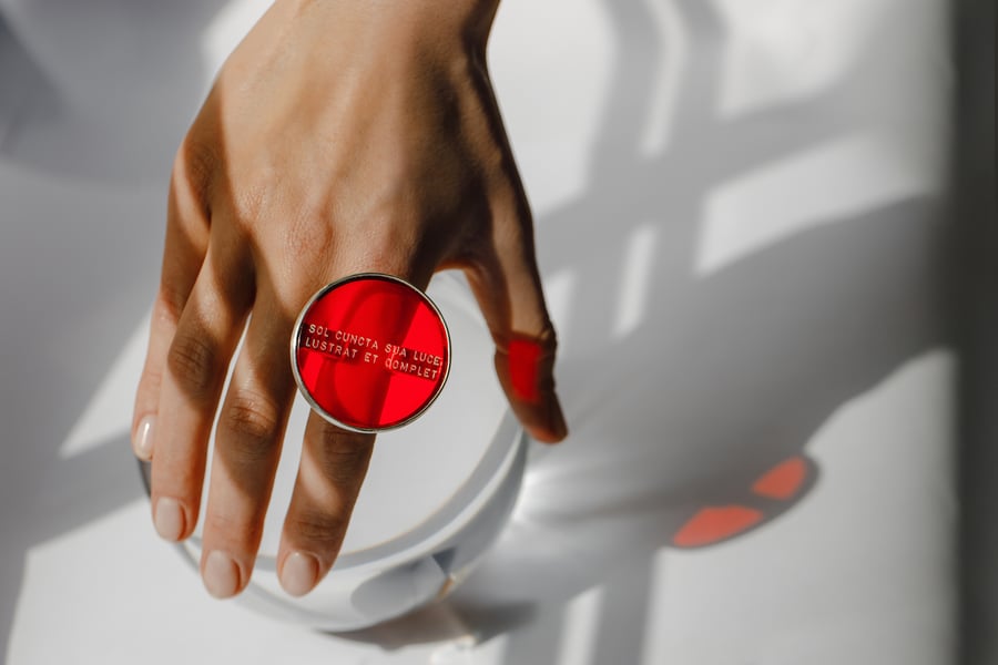 "The Sun illuminates.." silver ring with red acrylic glass 40mm · SOL CUNCTA SUA ·