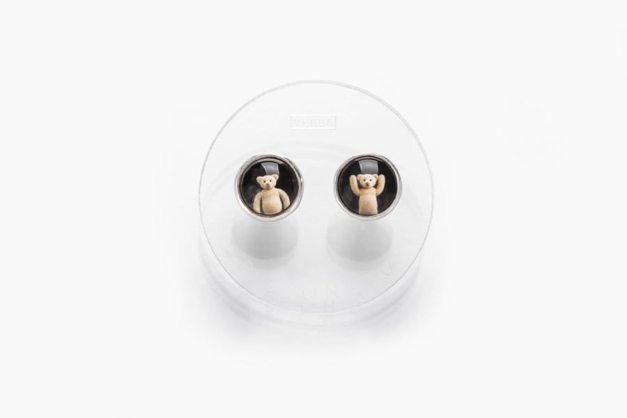 "With good intentions" teddy-bear silver earrings with photo and rock crystal · BONA MENTE ·