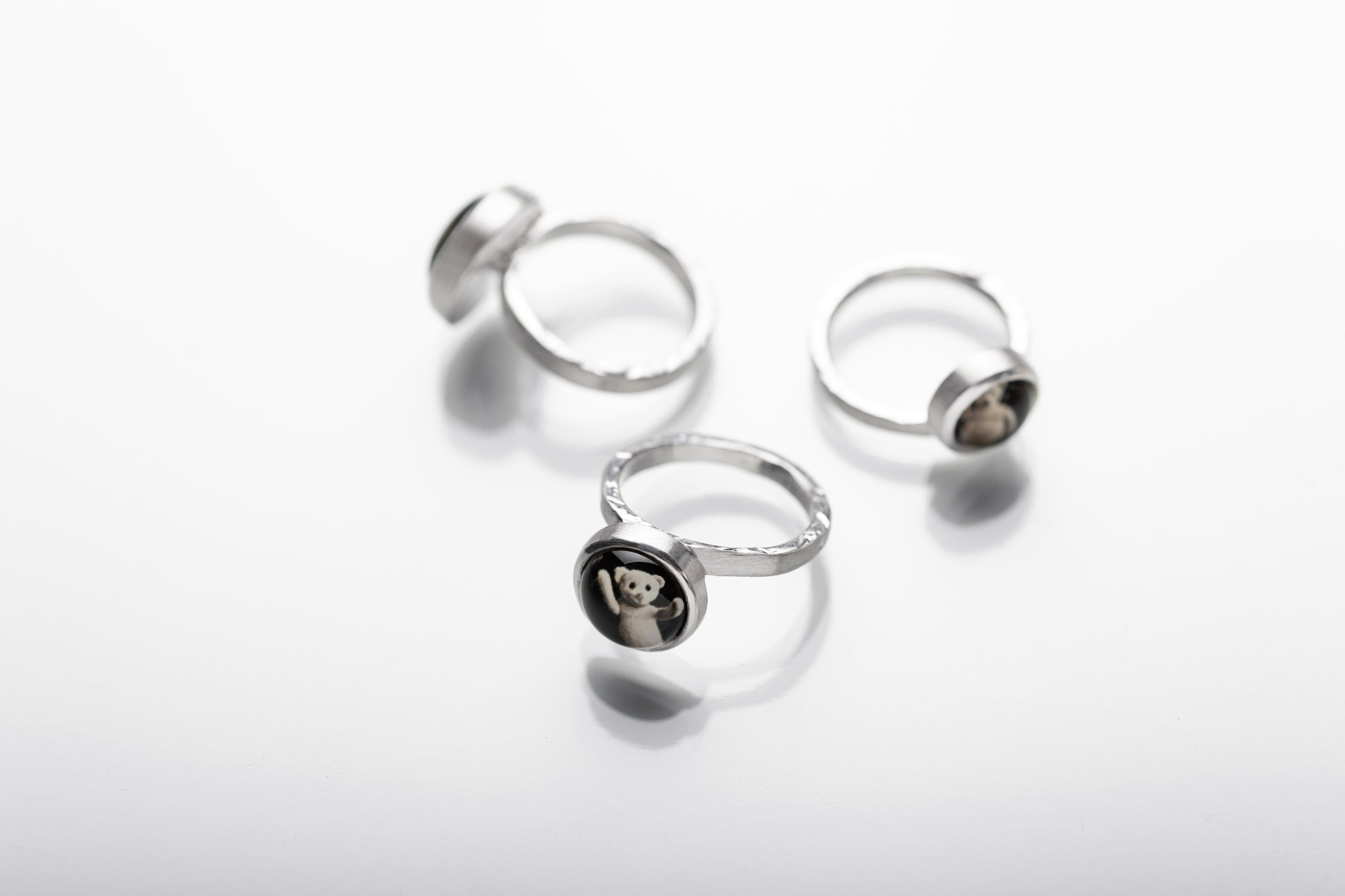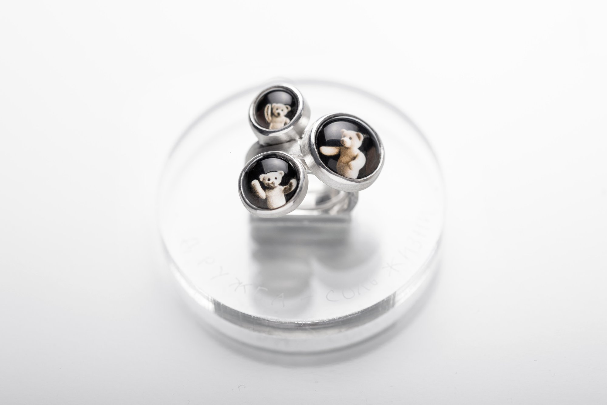 Teddy-bear’s sterling silver ring set with photos, rock crystals and inscription in Latin: